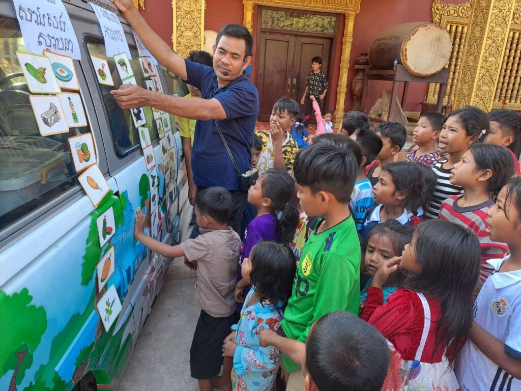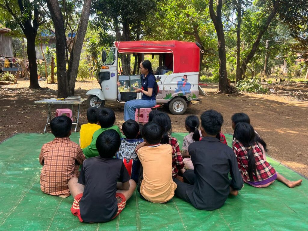 Né en 2000, le programme bibliothèques mobiles compte aujourd’hui 11 véhicules (7 bibliobus, 2 biblio bateau et 2 biblio tuk-tuks). Ils sillonnent plus d’une centaine de sites différents les routes et les eaux de sept provinces du Cambodge et des banlieues de Phnom Penh afin de porter le livre aux personnes défavorisées. Le manque d’infrastructures, telles que des bibliothèques publiques, prive les communautés des banlieues des villes et des zones rurales de l’accès aux livres.